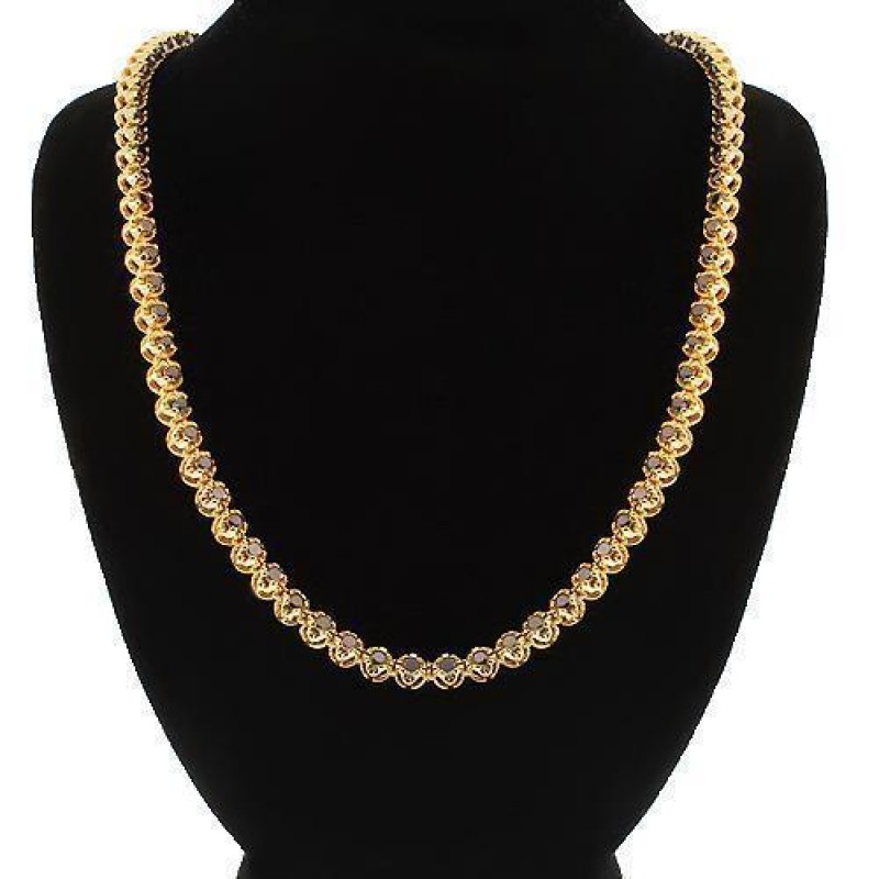 This elegant mens tennis chain is handcrafted in 14k yellow gold. The chain is prong set with black round cut diamonds.